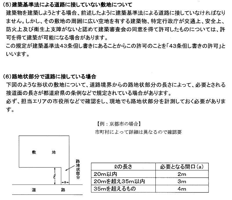 市役所建築指導課へいくと「再建築不可」と烙印を押される土地物件が多くあります。その多くが道路事情で問題がおこり不動産屋さんはまずは建築基準法の該当道路かどうかを一番に調査するはずです。下記に道路と建築物の敷地との関係について解説したものを添付させて頂きました。