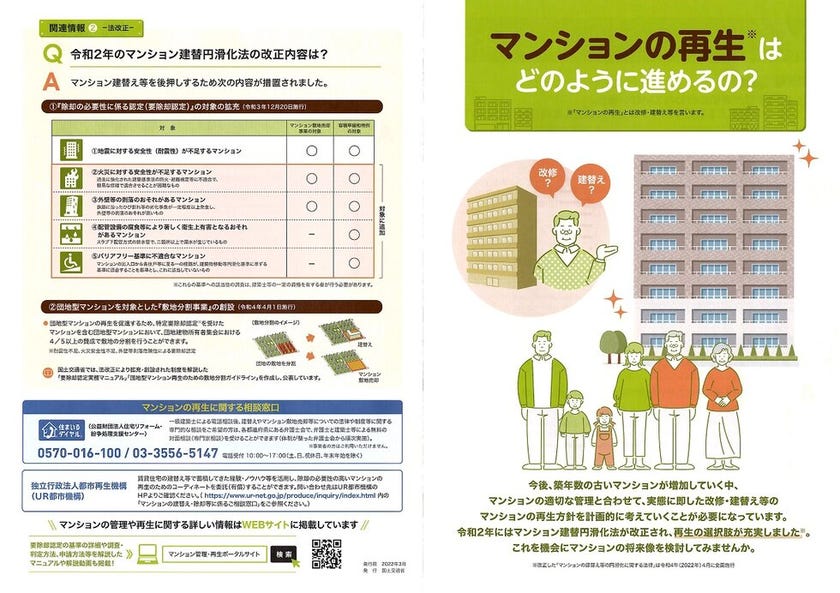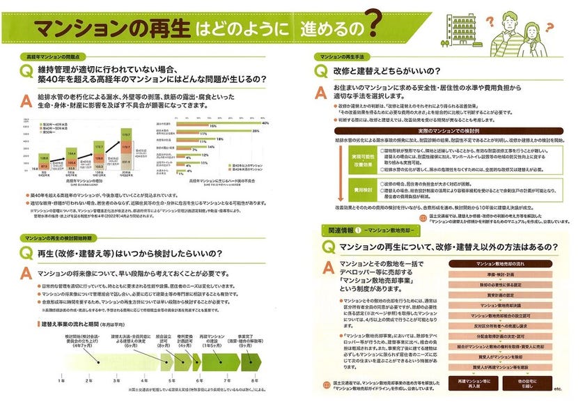 マンションの再生手法、マンション敷地の売却、高経年マンションの問題点、マンションの再生の検討開始時期、関連情報を国土交通省が作成したパンフレットを掲載します。マンションオーナー様はご参考下さい。