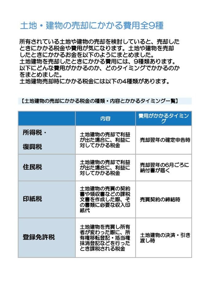 土地や建物を売るに当たりかかる費用をまとめております。どのタイミングで支払っていくか、また税金とその他の費用に分けて記載しておりますのでご参考ください。物件を不動産屋さんが預かるタイミングで説明があっ...