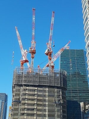 研修から解放されやれやれです。帰ってからすることが見えてきていい研修内容だったのではと思います。駅へと向かう道中で蟹の足のようなものが鉄橋の上に見えてきました。建設中のビルから出ているタワークレーンが4基でており結構な眺めです。自走式かどうかわかりませんがせり上げ足場が設置されており大型の高層ビルの現場感をかもしだしておりました。スーパーゼネコンと言われる大手5社の施工かと思いきや以外にも準大手と呼ばれるゼネコンさんの施工のようです。高い建物は高層階へいかに早く材料を搬入するのが工期短縮の決め手となります。建物内部にもロングスパンエレベーターも何基か設置しているとは思いますがこれから現場へ入場してくる仕上げ業者さんは大変だろうなと思いながら眺めておりました。