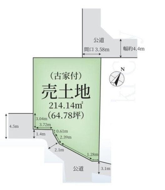 | 土地面積 | 公214.14㎡(64.77坪) | 接道 | 南側(公道)幅 約4.5m 間口 約18.10m 北側(公道)幅 約4.4m 間口 約3.58m |